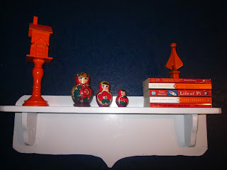 I love the way it is turning out. And I like having the desk in this corner because it's one of the first areas you see when you walk in the room. I added a couple of shelves above the desk to hold some of my orange accents. As you can see, these shelves were originally various colors.